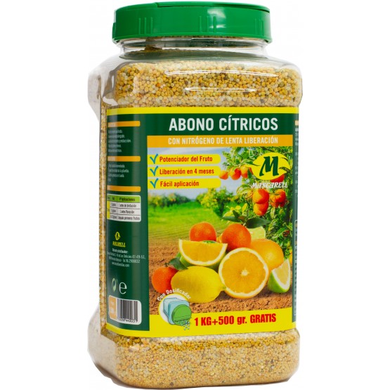 Abono micro granulado ideal para todo tipo de cítricos como el limonero, naranjo, pomelo, etc. Contiene una elevada dosis de nitrógeno con un contenido equilibrado de fósforo para intensificar la floración y el cuajado de los frutos, con potasio para conseguir una correcta coloración y dulzura de los frutos. Producto de lenta liberación. Su composición permite una perfecta sincronía entre degradación/liberación del abono y necesidades de la planta.
