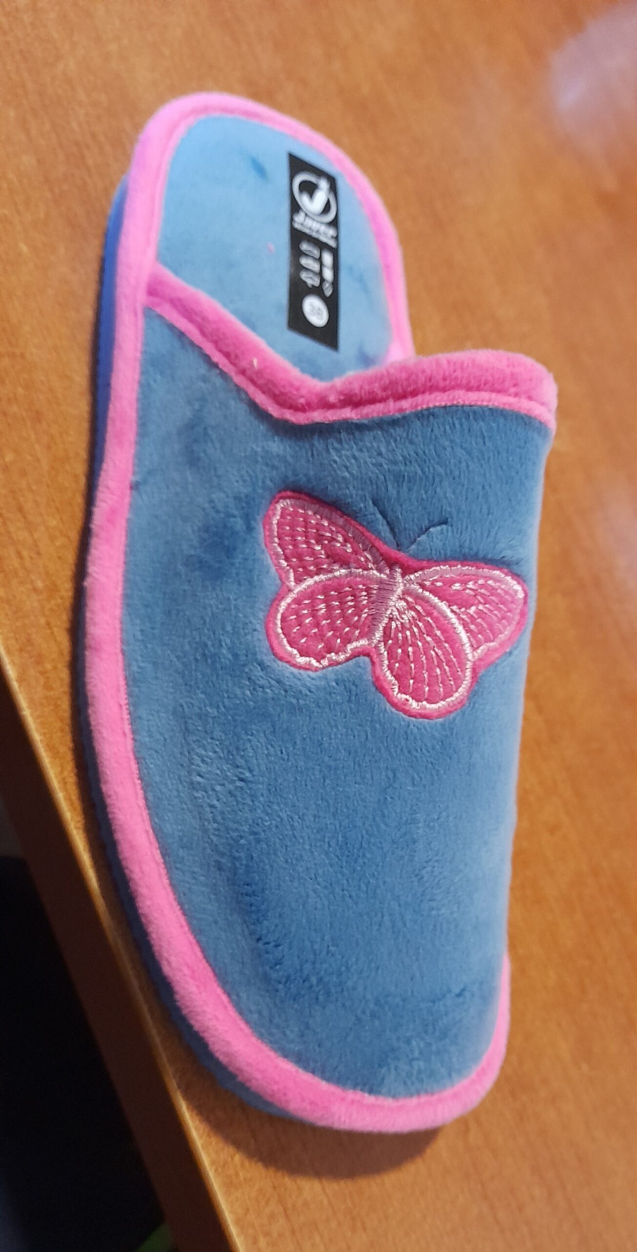 ZAPATILLA DE CASA ABIERTAS AZULES Y ROSA CON MARIPOSA Zapatillas de casa abiertas muy cómodas en color azul y rosa con ilustración de mariposa.